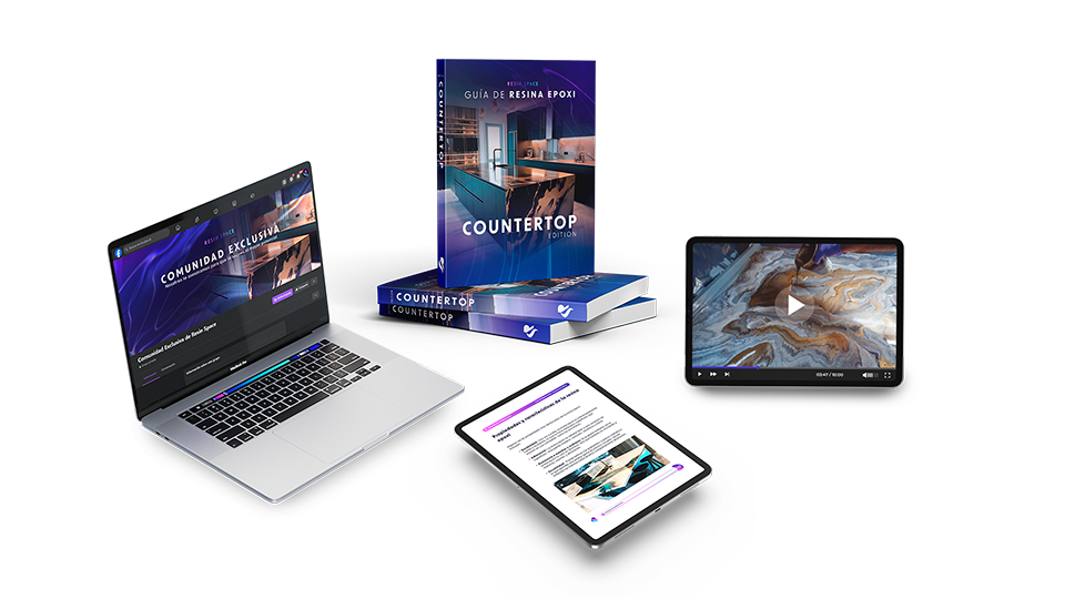 La guía contiene instrucciones detalladas para aplicar resina epoxi en encimeras, un video exclusivo de la técnica de Pouring, consejos prácticos para obtener acabados duraderos y profesionales, acceso exclusivo a nuestra comunidad en Facebook y una guía básica para crecer tu negocio con encimeras hechas de resina epoxi.
